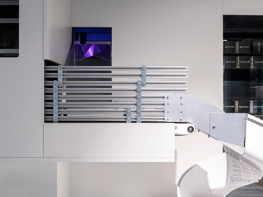 Nuestras opciones MT.Transport transportan medicamentos de forma rápida y eficiente hasta el mostrador o el taller. Esto puede hacerse desde la primera planta, desde el sótano... Los productos solicitados se transportan fácilmente de A a B.
